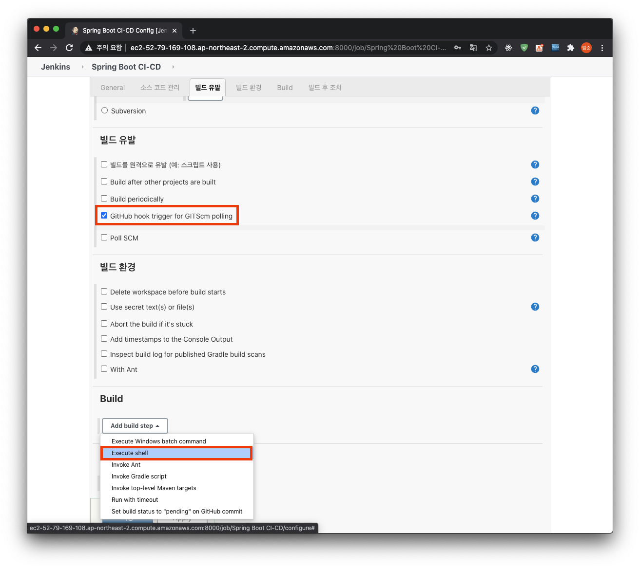 github의 webhook이 빌드를 유발하도록 허용하고, 빌드 동작을 shell 명령어를 실행하도록 한다.