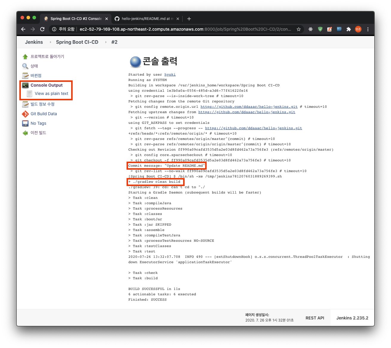 README.md를 업데이트한 commit인 "Update README.md"에 대하여 아까 설정해뒀던 shell 명령어인 "./gradlew clean build"가 실행되었음을 확인할 수 있다.