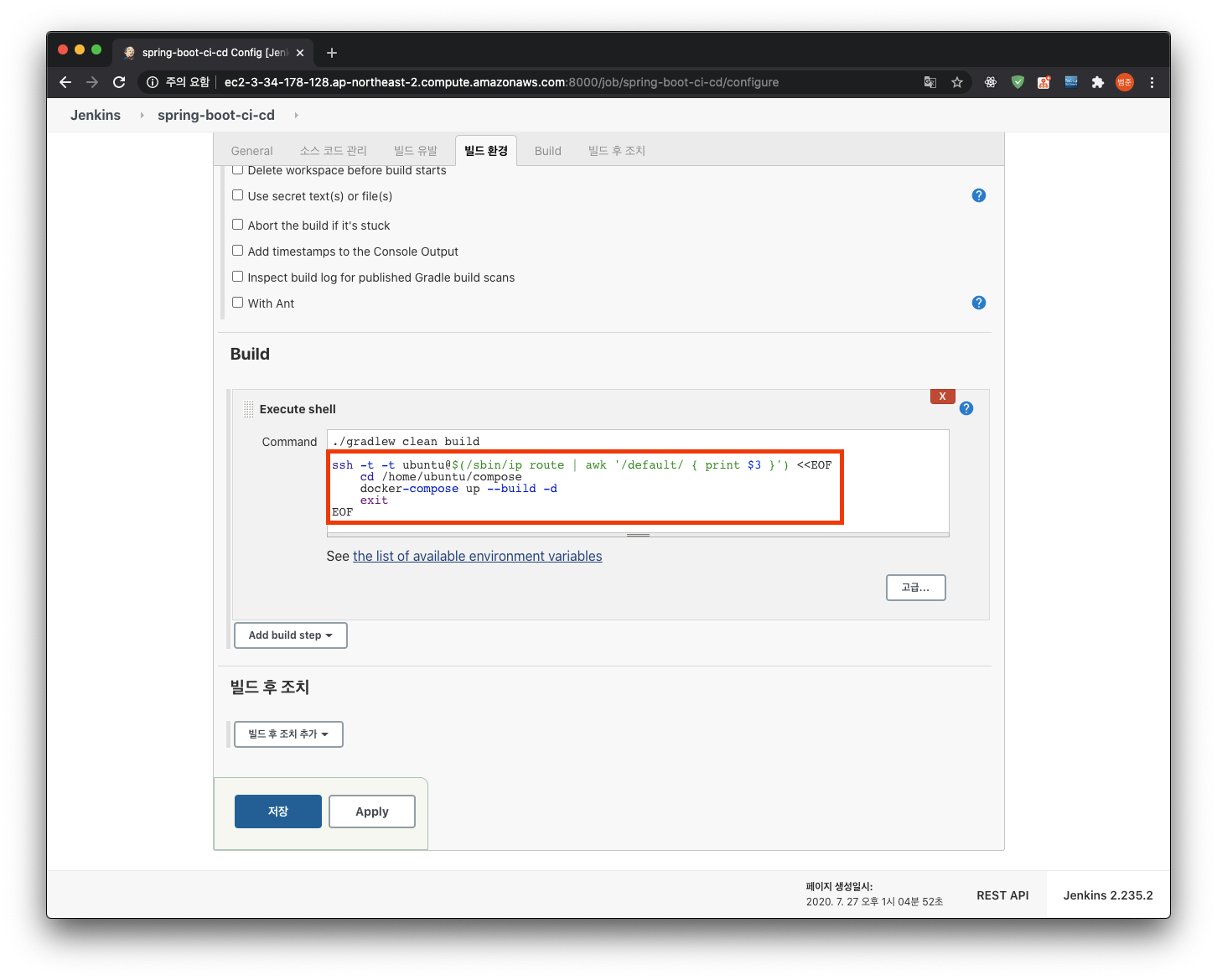 마지막으로, 도커 컨테이너에서 ec2 로컬로 명령을 보내는 방법을 알았으니 이를 jenkins에 적용만 하면 된다.
