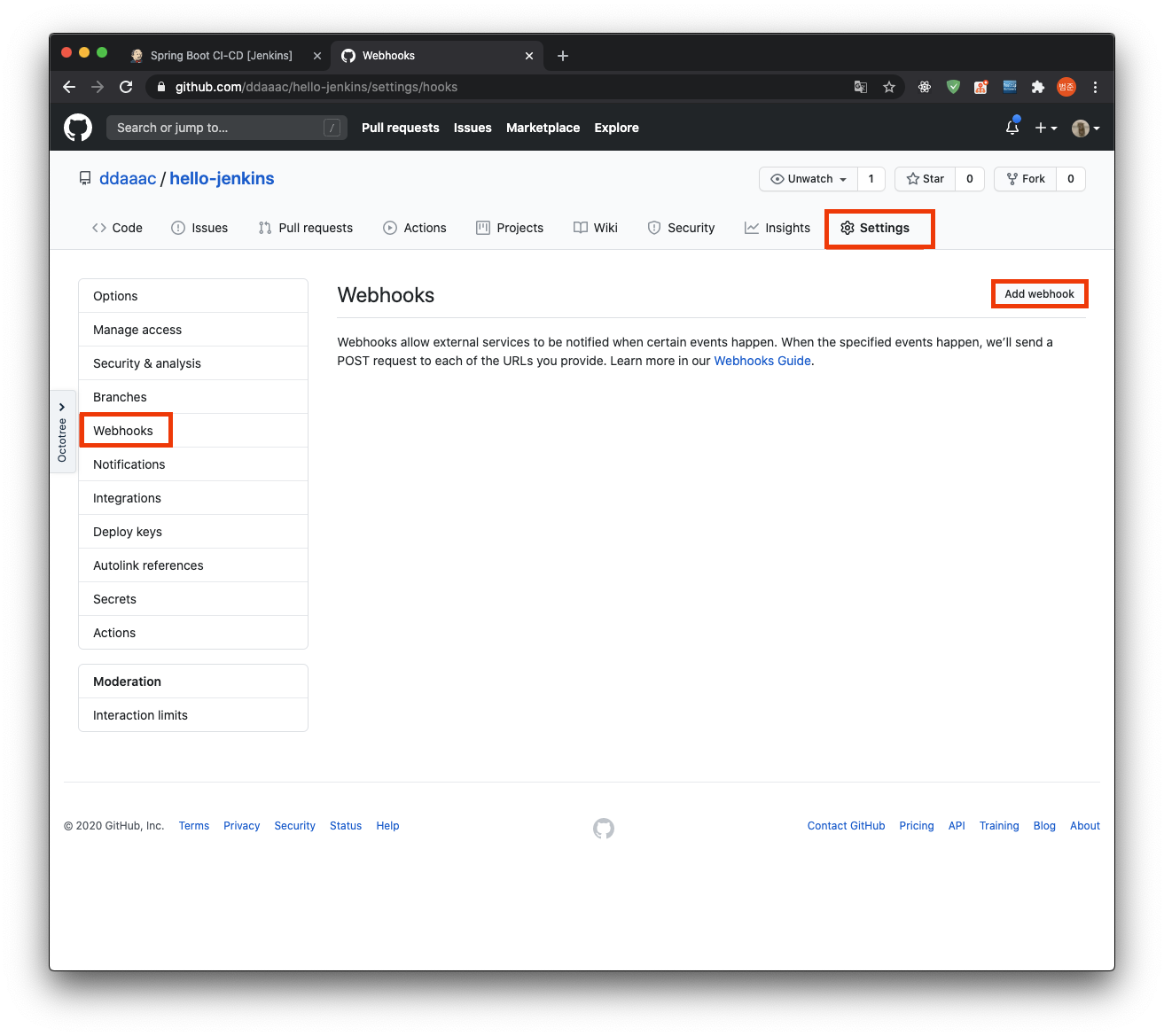 이제 jenkins 서버는 github 저장소에서 webhook이 들어오기를 기다리고 있다. 반대로, github 저장소에서도 변경사항이 일어나면 jenkins 서버로 명령을 전송하는 설정을 해야한다. 아까 생성한 저장소로 이동해서 webhook setting을 하자.