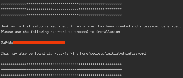 현재 실행중인 jenkins-compose란 이름의 컨테이너의 로그를 출력한다. 우리가 받아온 jenkins/jenkins:lts 이미지는 비밀번호를 로그로 남기게 되어이씩 때문에 화면에 비밀번호가 출력 될 것이다.