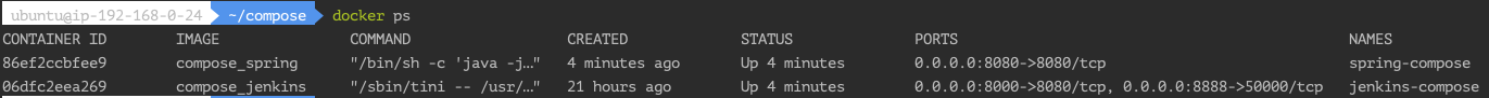 - 컨테이너의 이름은 jenkins-compose이다.