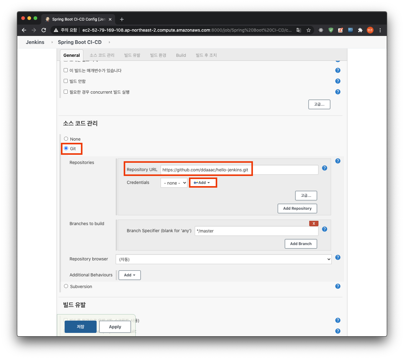 다음 페이지의 소스 코드 관리에서 git을 선택한다. 앞에서 만든 Spring boot 프로젝트를 업로드한 github 저장소의 주소를 적고 유저 인증 정보를 추가하기 위해 아래의 `Add` 버튼을 클릭한다.