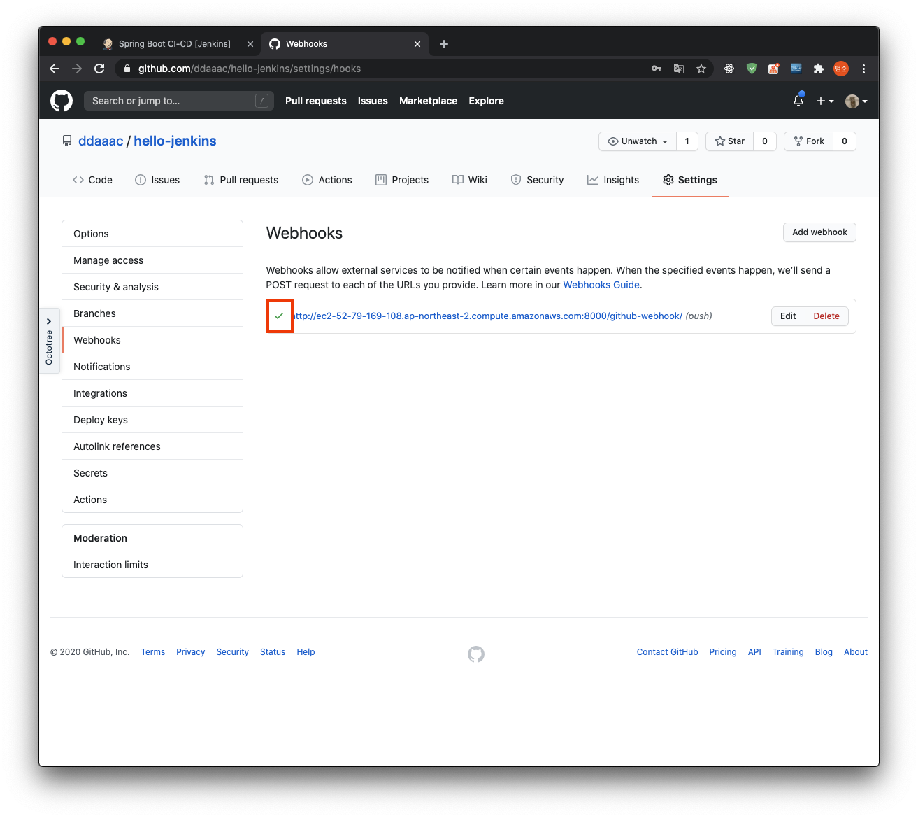 아래 초록색 체크 표시가 뜨면 정상적으로 github 저장소에 Jenkins 서버가 등록된 것이다.