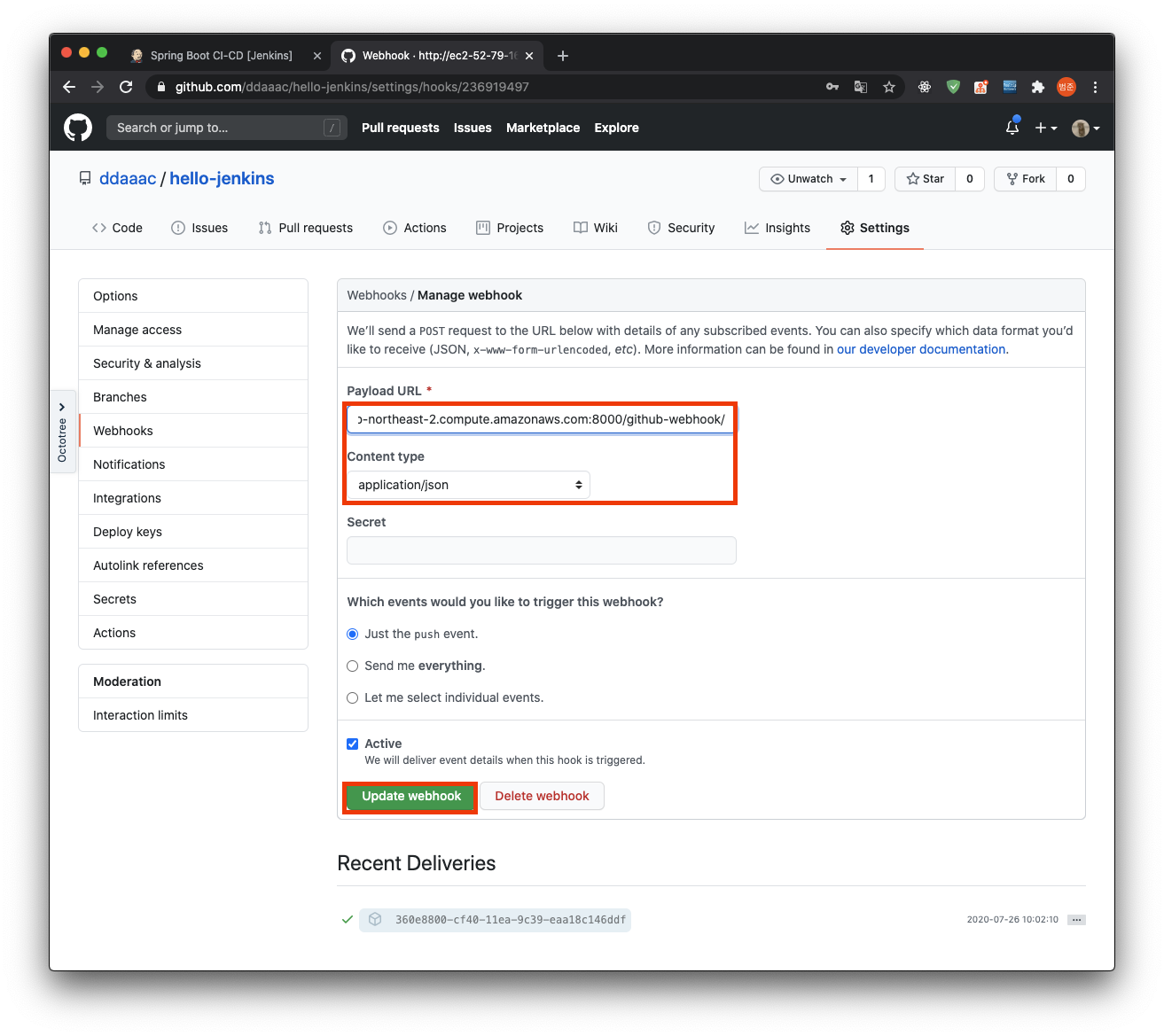 payload URL에 http://[ec2-주소]:8000/github-webhook/ 를 입력한다.