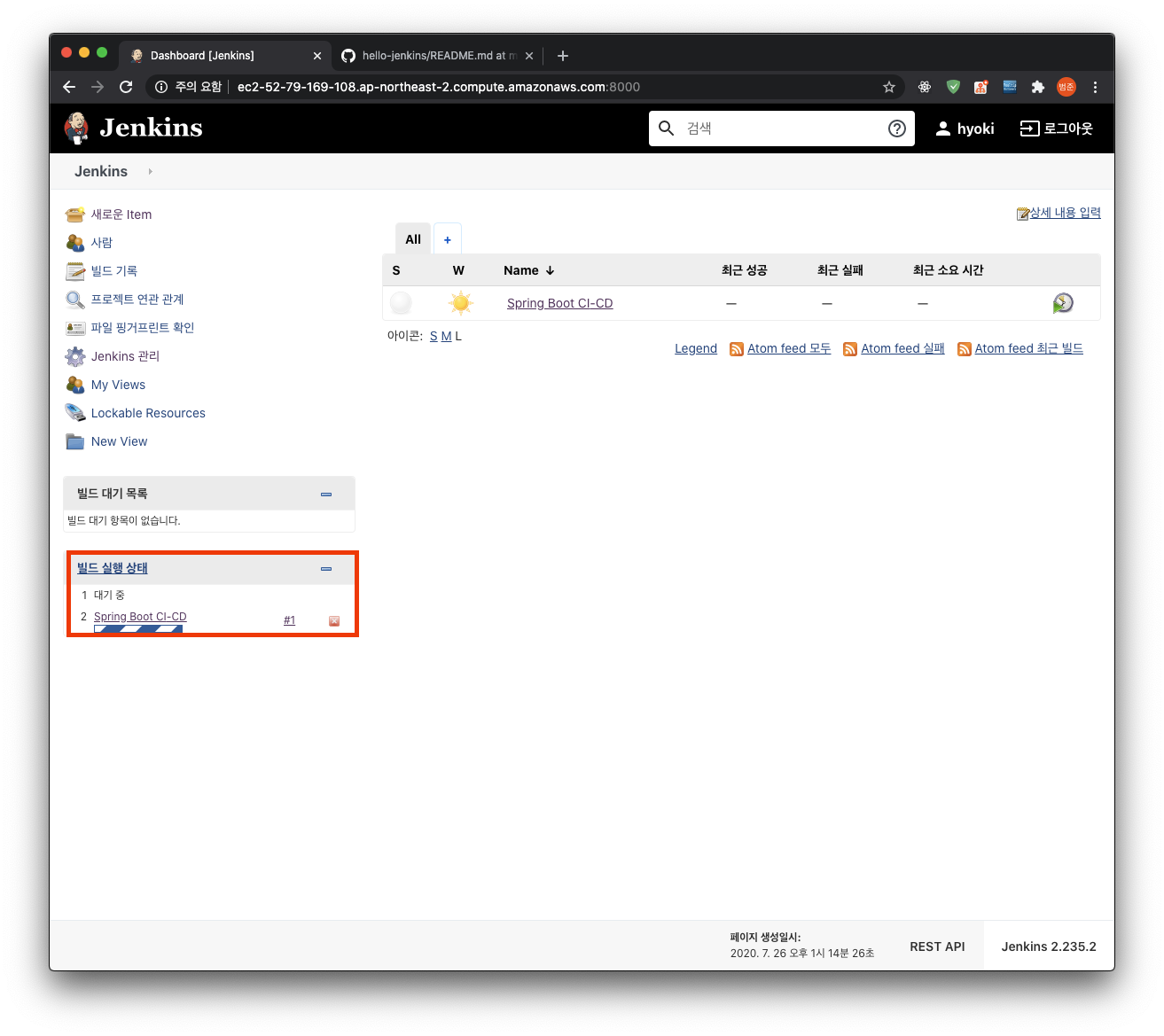 jenkins와 spring 컨테이너가 모두 잘 돌아가는 것을 확인할 수 있다.