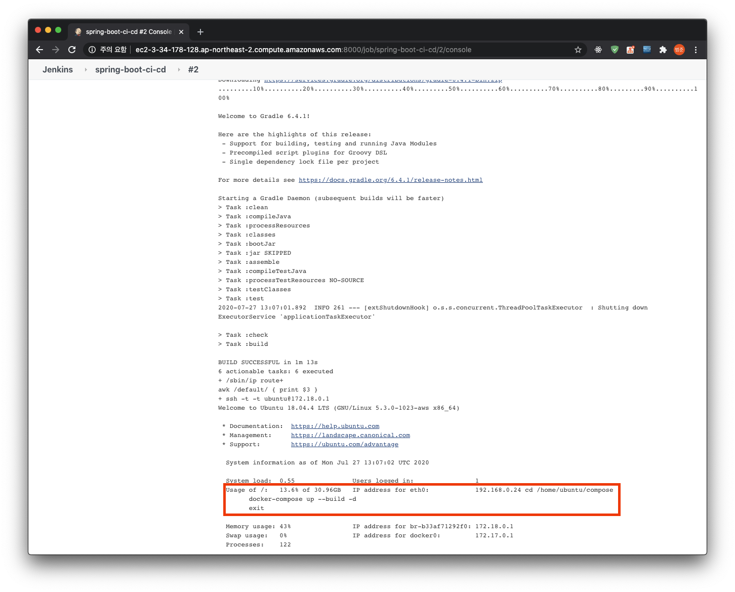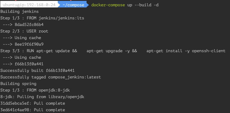 아까 빌드했던 jenkins 이미지는 캐싱되어 있기 때문에 빠르게 지나가고, 한번도 빌드하지 않았던 spring 서비스는 pull부터 빌드과정을 거치게 된다.