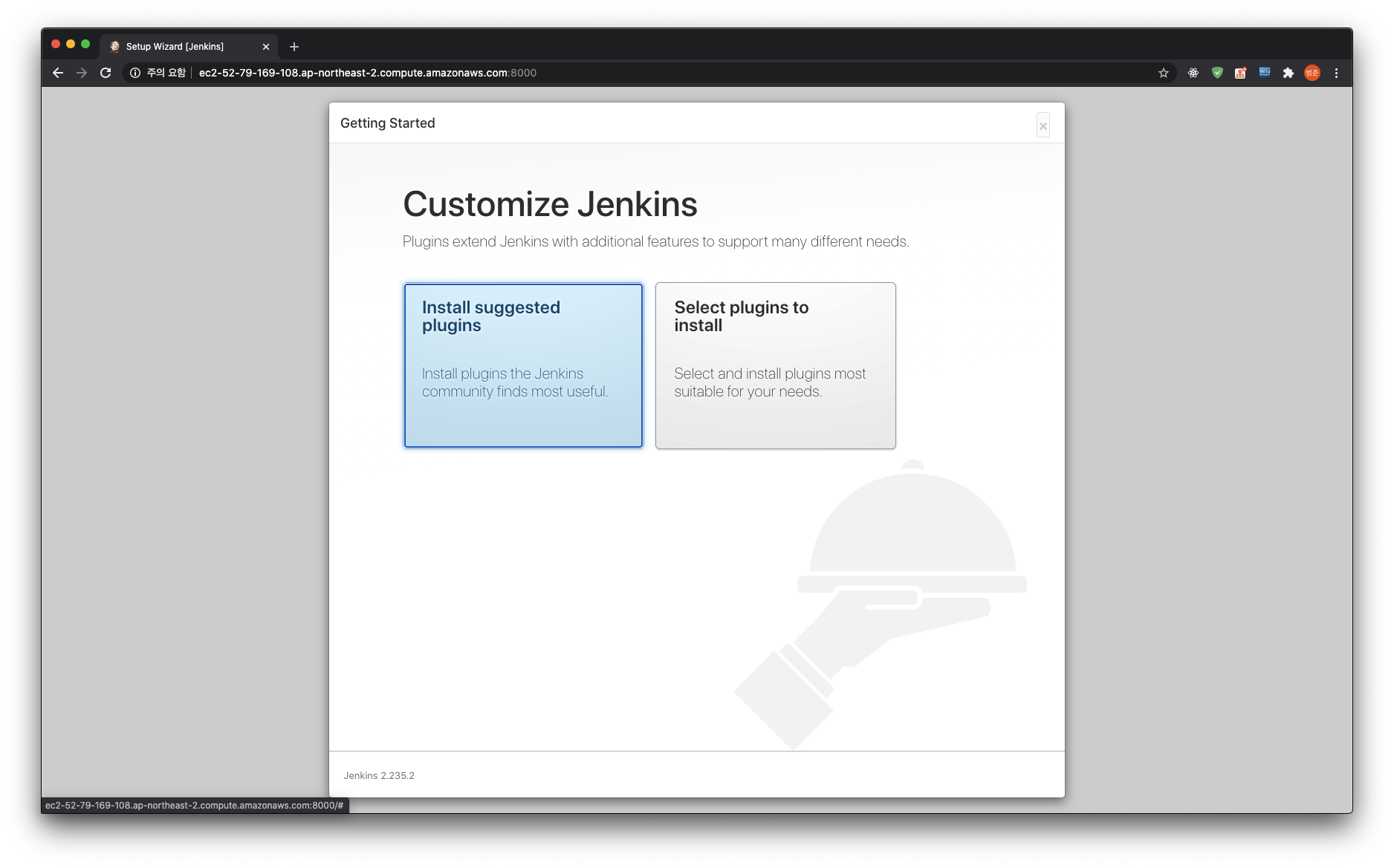 이 비밀번호를 붙여넣으면 된다. 다음 화면에서는 suggested plugin을 설치해준다.