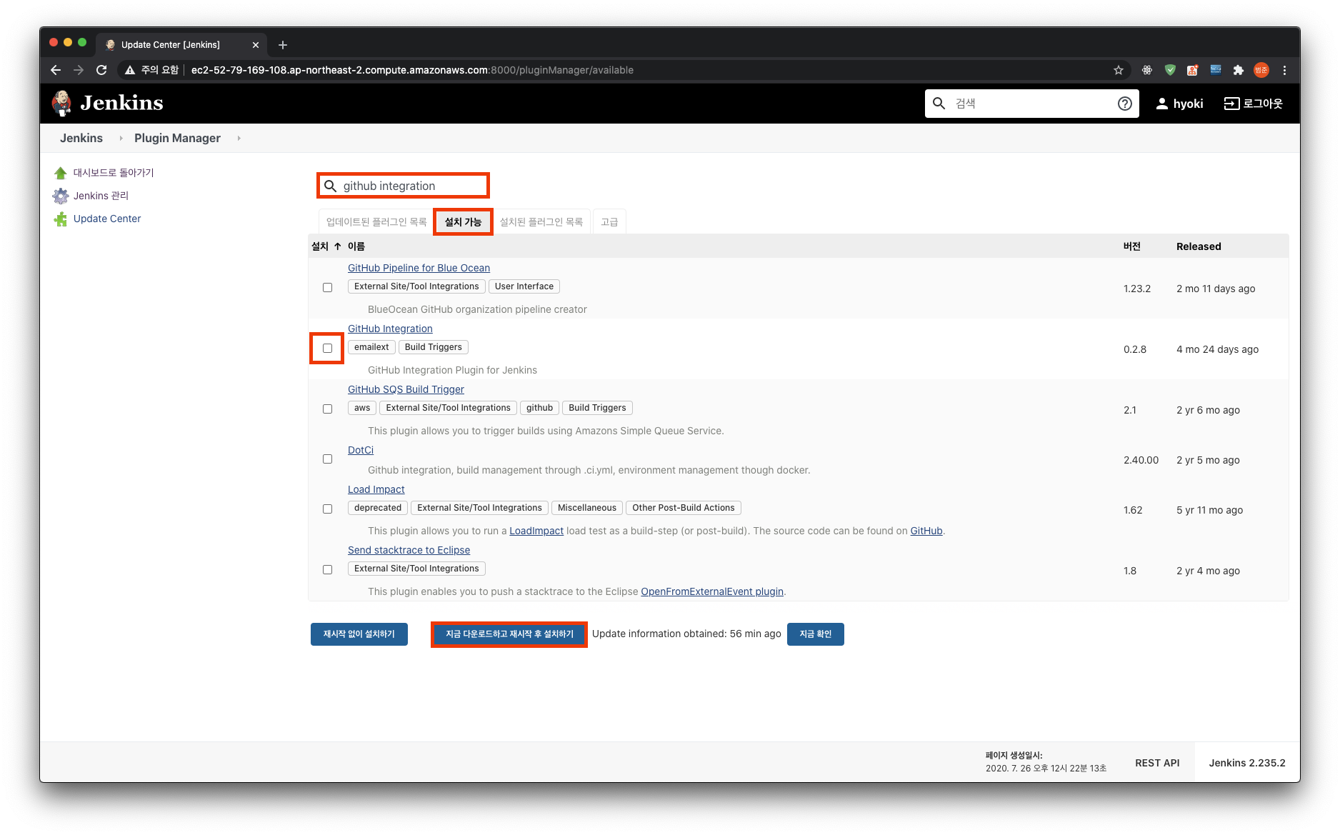 github으로부터 저장소의 변경 정보를 받아오기 위해 github integration을 설치해준다. 재시작이 안된다 싶으면 새로고침을 몇 번 누르다보면 된다.
